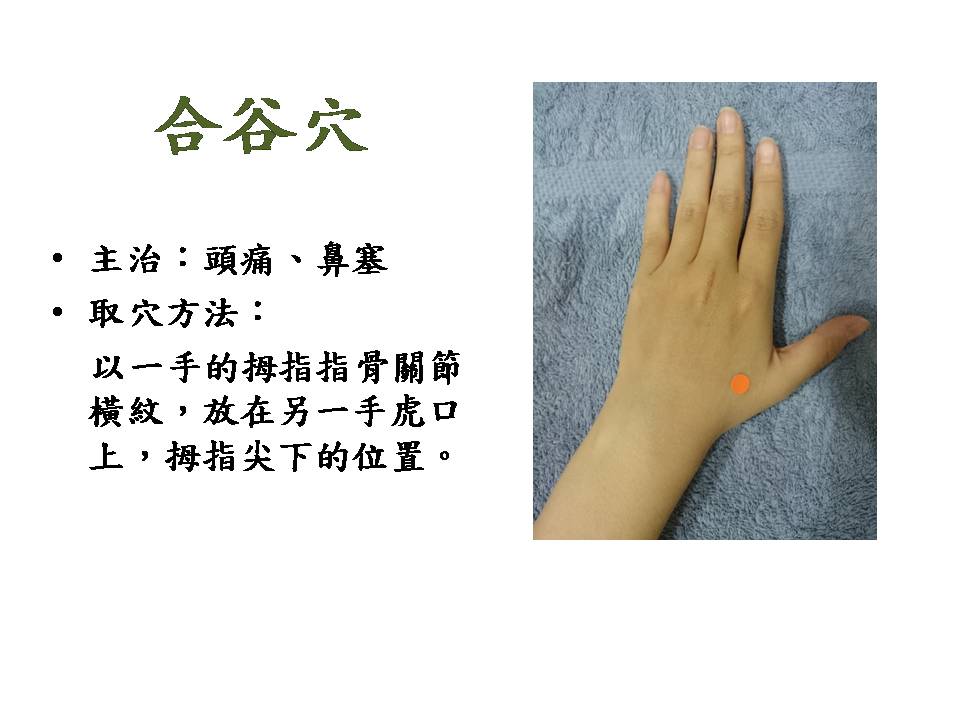 當感冒症狀出現時,最重要的是尋找醫生做適當的治療,並在空閒的時間多休息,飲食以清淡好消化為主,以下介紹幾個能輔助舒緩症狀的穴位,一個部位按壓十次,每次10秒鐘。